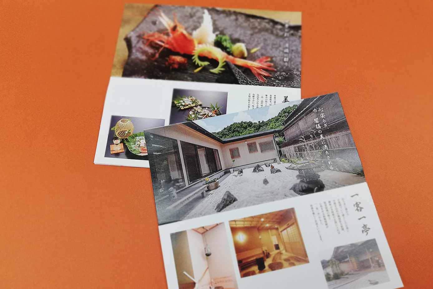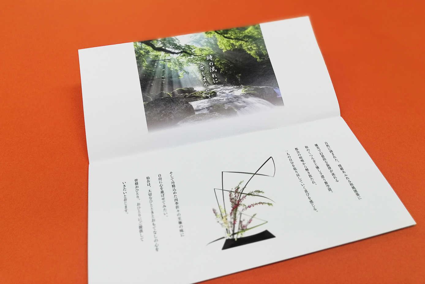 創業30年、ゆったりとした佇まいの料亭です。古くなった店舗案内やメニュー表をリニューアルしたいとのお話をいただき、店舗のゆったりした雰囲気が感じられるデザインを目指しました。
