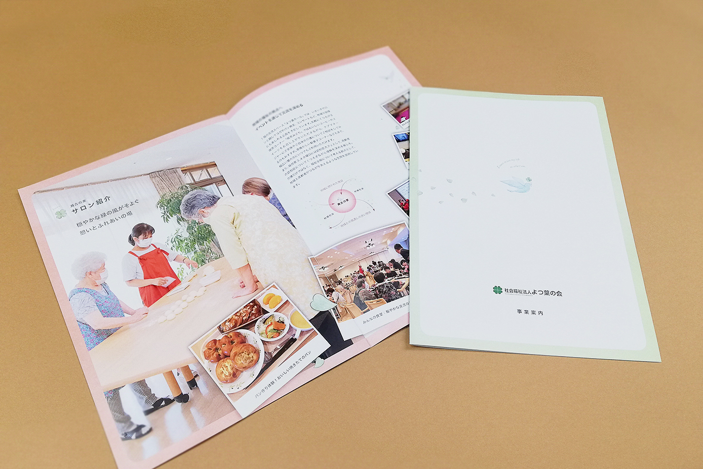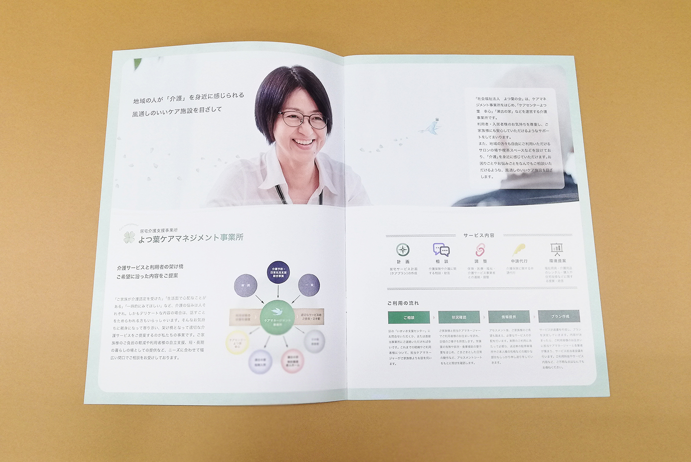 障害者支援施設や生活介護、短期入所、居宅介護等など幅広く事業をおこなっている、よつ葉の会様。 ご利用者様とサービス施設のマッチングを行うケアマネジメント事業所様よりご依頼をいただきました。 これまでは社内で作成した資料で案内を行っていたが、もっと内容がわかりやすく信頼感のあるパンフレットに切り替えたいとのご要望をいただき、やさしさを伝える鳥のイラストをメインにデザインさせていただきました。