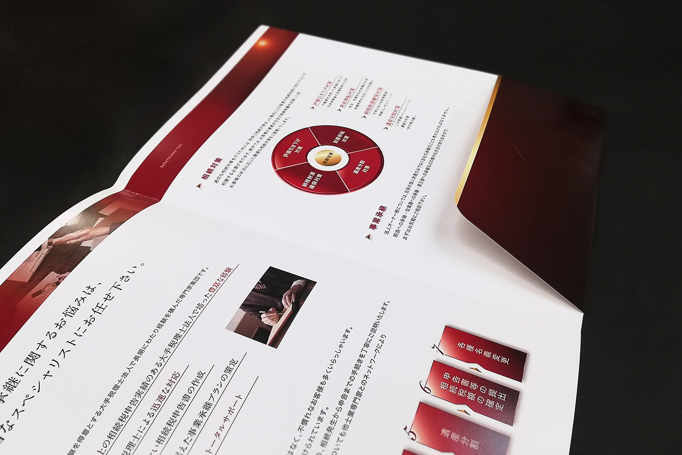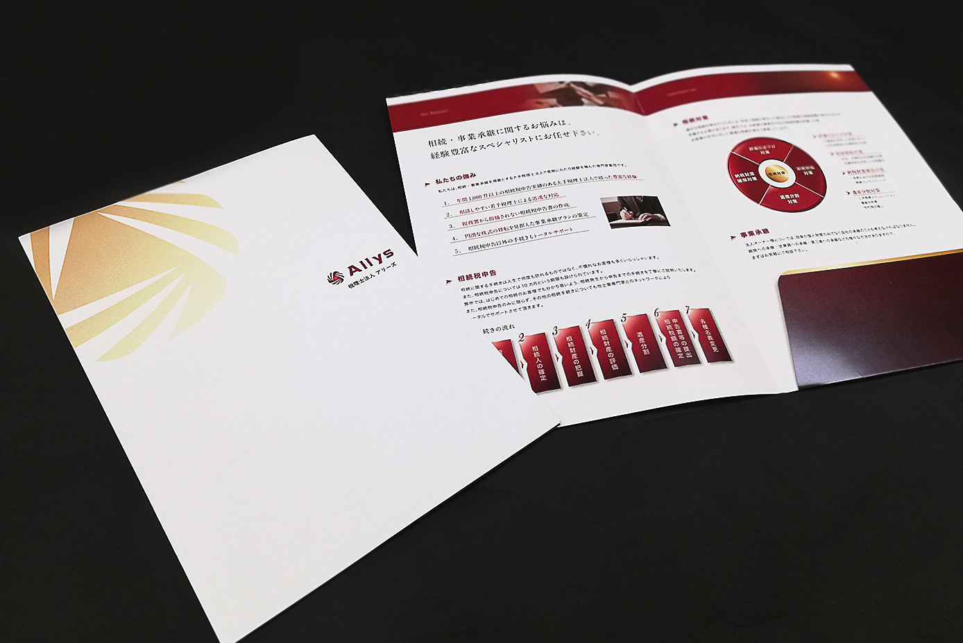 顧客層へ説得力のあるラグジュアリーなデザインというご依頼をいただきました。 案件に応じて資料を使い分けられる、ペーパーフォルダータイプを採用。 重めの配色で落ち着きのあるデザインをご提案し、作成させていただきました。